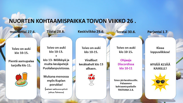 To 30.6. Toivo auki klo 10-15. Ohjaaja tavattavissa Discordin teksti-ja puhekanavalla klo 10-11 välillä. Tänään ollaan vielä auki ennen kesätaukoa. Tule viettämään aikaa yhdessä💛